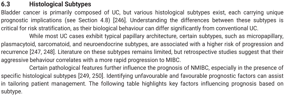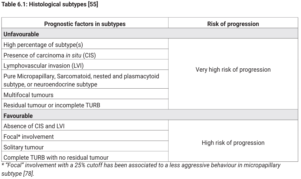 指南中增加了关于组织学亚型的新章节6.3节,包括表6.1,其中概述了不同亚型的预后因素和进展风险。