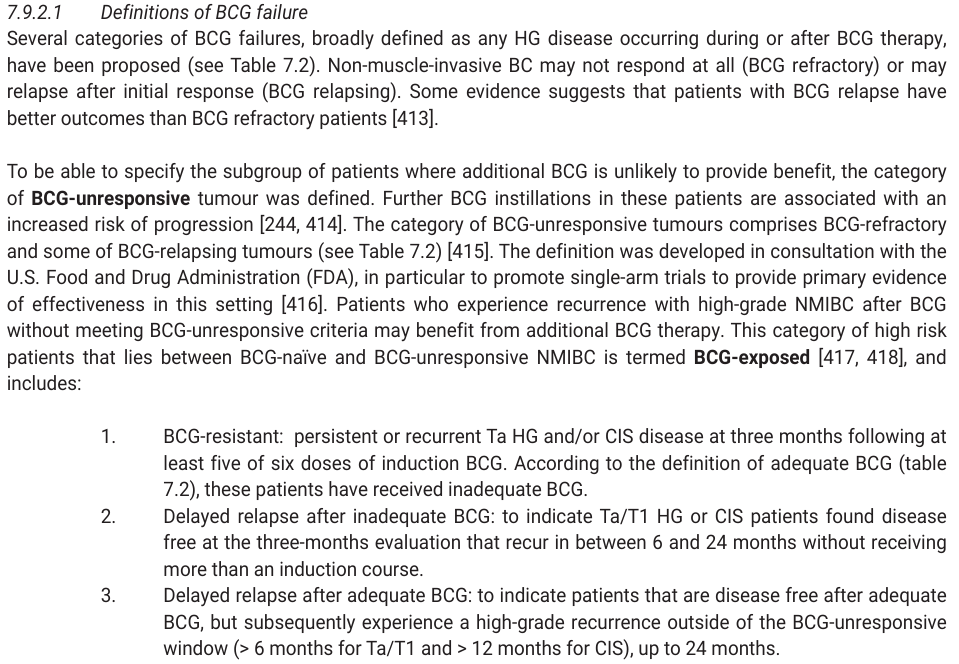 第7.9.2节“膀胱内BCG治疗期间或之后的复发”已重新整理,以更清楚地呈现BCG失败的定义和BCG无反应肿瘤的治疗方案。