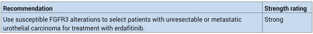 第6.5节中关于使用易感FGFR3变异选择不可切除或转移性尿路上皮癌患者进行厄达替尼治疗的新证据和建议。