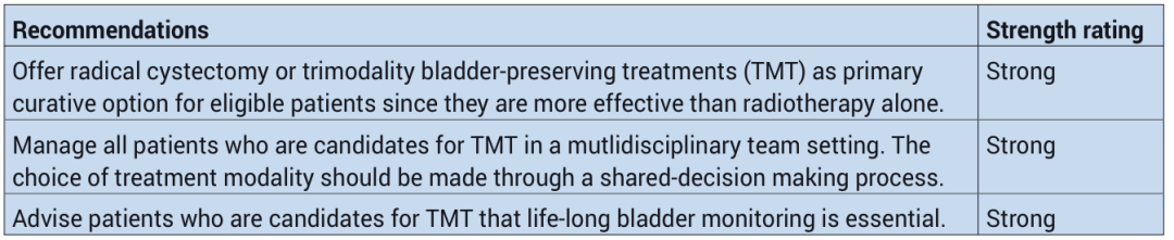 7.5.4.6节中的新建议。使用共享决策过程在多学科团队管理所有适合接受三联膀胱保留治疗的患者。