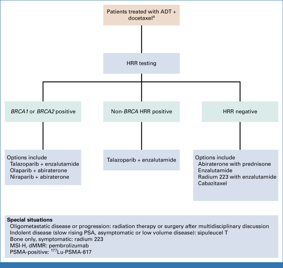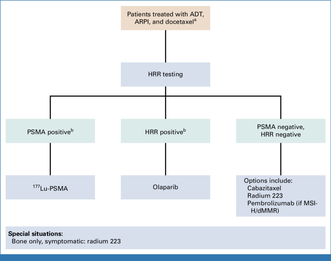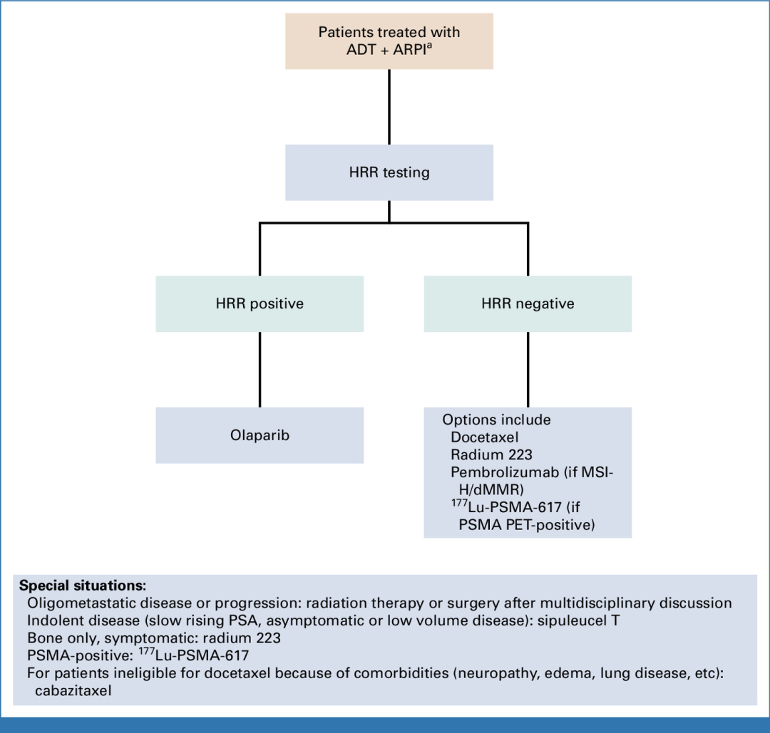 专家组建议,对于所有患者,无论其是否存在HRR改变,均应使用多西他赛化疗、镭-223或177Lu-PSMA-617(对于PSMA正电子发射断层扫描阳性的患者)。(证据质量:中等;推荐强度:强)