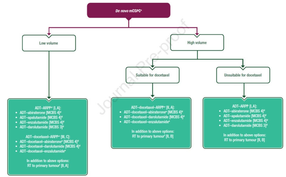a) 对于接受ADT-多西他赛-ARPI治疗的患者,应在多西他赛治疗结束后开始前列腺放疗[III,A]。