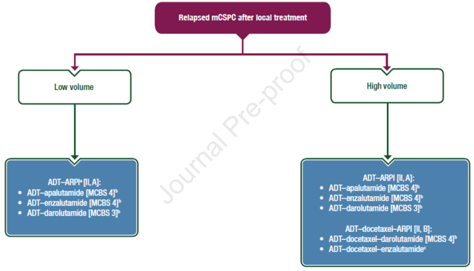2. 使用ADT-ARPI治疗异时性低肿瘤负荷的mCSPC时,应权衡患者的预期寿命和合并症[II,A]。