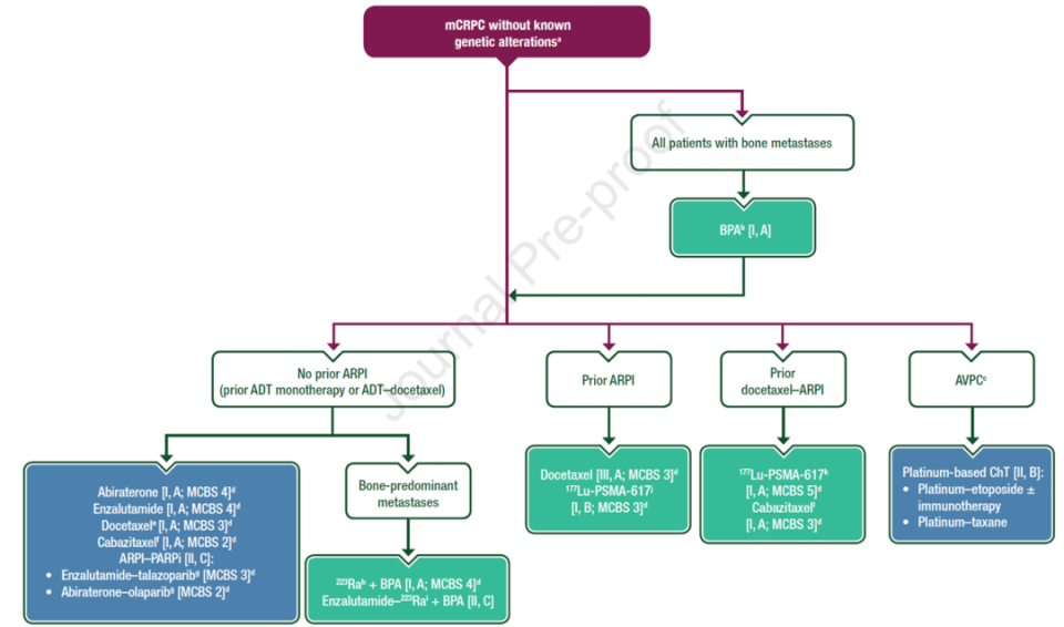 b) 可考虑使用恩扎卢胺-223Ra联合BPA[II,C级;未获EMA或FDA批准]。