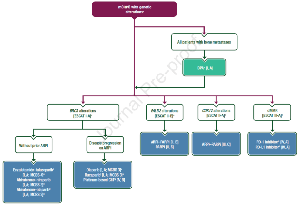 d) 对于部分患者,可考虑使用ARPI-PARPi联合方案[恩扎卢胺-他拉唑帕利(MCBS v2.0评分:3;已获EMA批准,但在此适应症中未获FDA批准)或阿比特龙-奥拉帕利(MCBS v2.0评分:2;已获EMA批准,但在此适应症中未获FDA批准)][II,C级]。