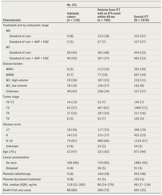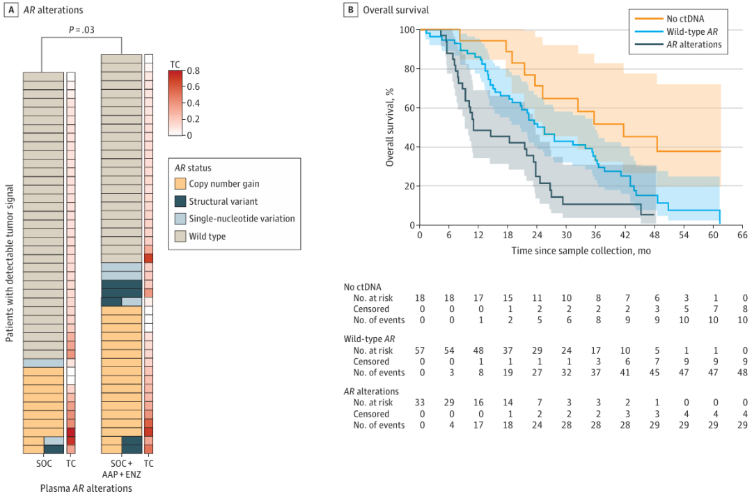 既往研究表明,在雄激素剥夺疗法(ADT)开始时加用醋酸阿比特龙和泼尼松龙(以下简称阿比特龙)可改善转移性前列腺癌和极高危局部晚期前列腺癌患者的生存期。通过对血浆DNA进行测序发现,在ADT单药治疗进展后,转移性去势抵抗性前列腺癌(mCRPC)患者在接受阿比特龙或恩扎卢胺治疗时,雄激素受体(AR)的基因组改变会导致耐药性。目前尚不清楚在ADT开始时强化治疗,是否会影响AR的改变情况。