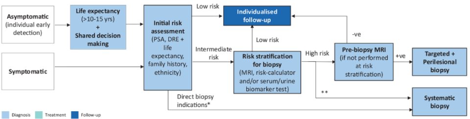 前列腺磁共振成像 (MRI) 结合了不同的成像序列,以准确识别前列腺癌。当怀疑患有前列腺癌时,根据 PSA 和/或DRE结果,即可进行MRI检查。除了提示前列腺癌的存在外,成像还可以指导靶向前列腺活检,并提供分期信息。