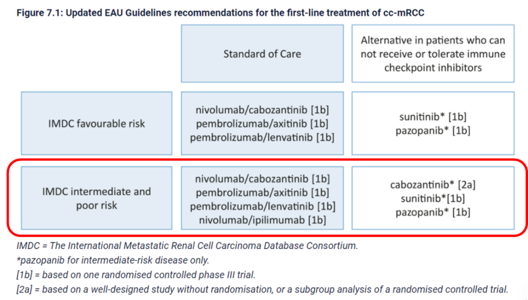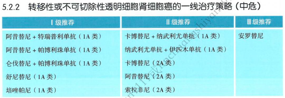 对于中危的转移性或不可切除性透明细胞肾细胞癌的一线治疗,2024版CSCO指南推荐的1A类治疗方案包括多种靶免联合治疗方案;同时,EAU指南也推荐使用靶免联合治疗或双免治疗。