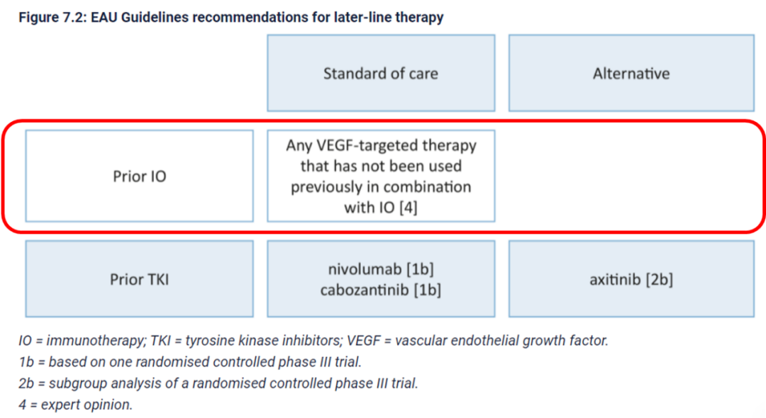 对于免疫联合治疗失败的患者,在更新的2024版CSCO指南中,I级推荐为参加临床研究,II级推荐和III级推荐则包括了多种靶向治疗药物;EAU指南推荐,若患者既往未使用过VEGF靶向联合免疫治疗方案,可进行尝试。