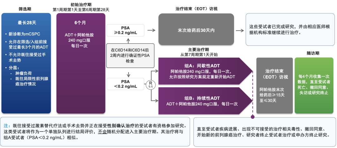 LIBERTAS是一项全球、多中心、III期临床研究,围绕“深度缓解后的治疗优化”这一关键临床问题展开设计。研究旨在评估,在mHSPC患者接受6个月阿帕他胺联合ADT治疗并达到PSA<0.2ng/mL后,间歇性ADT是否能够在维持影像学无进展生存(rPFS)的同时,减轻潮热负担并改善生活质量。