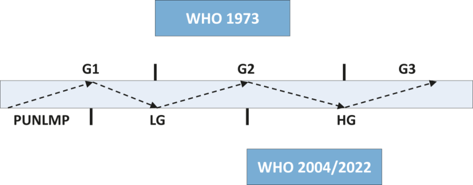 更新图4.1:根据WHO 1973、WHO 2004/2022分级系统以及两种系统三级和四级混合分级方案绘制的肿瘤示意图。