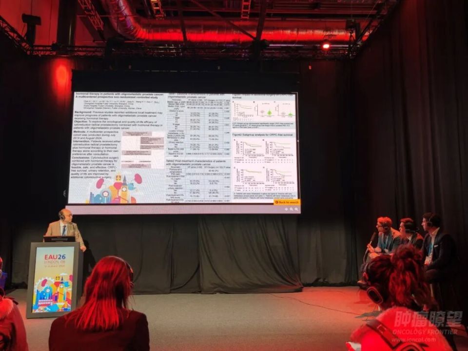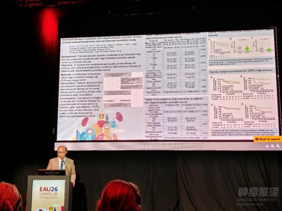 编者按:第41届欧洲泌尿外科学会年会于2026年3月13日至16日在英国伦敦举行,是全球泌尿外科领域最重要的学术平台之一。本次会议设立“Cytoreductive treatment in mHSPC”主题,旨在探索转移性前列腺癌领域前沿研究成果。复旦大学附属中山医院泌尿外科郭剑明教授团队主导的寡转移前列腺癌内分泌联合手术治疗方案(CHoM)凭借其创新的治疗理念成功入选该专题(摘要号:P0156),由徐磊医师在现场进行深度展示与交流。