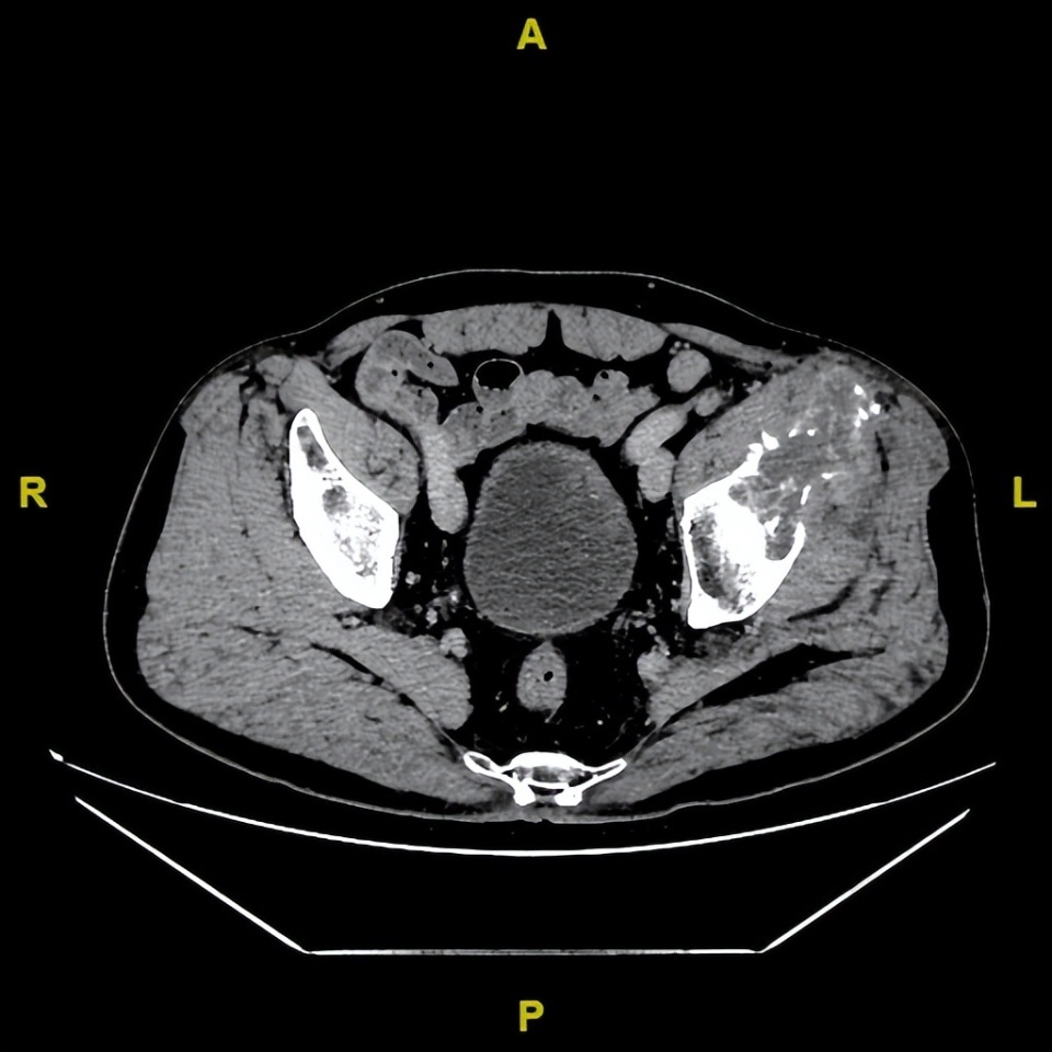 2022年10月:因左髋部疼痛伴左下肢活动不利,于外院行左侧髋关节CT提示:左侧髂骨见片状溶骨性骨质破坏,呈软组织密度团影,大小约55mm x 68mm;余左髋关节诸骨见骨质增生,考虑骨转移,疾病进展(PD)。