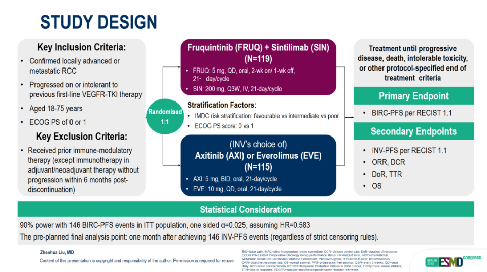 晚期肾细胞癌(RCC)5年生存率不足20%[1-2],对于一线治疗失败的患者,目前临床上仍有亟待满足的临床需求;特别是对于靶向联合免疫作为二线治疗方案,尚缺乏高级别、大样本III期确证性研究的循证医学证据。2025年ESMO大会公布的FRUSICA-2研究,作为国内首个靶向联合免疫用于晚期肾癌二线治疗的III期确证性研究,提示呋喹替尼联合信迪利单抗组合,或可为此类患者带来一定的生存获益。本期分享的研究内真实病例,二线使用该方案序贯单药治疗,PR已维持38个月,用临床实例解读本方案的表现。