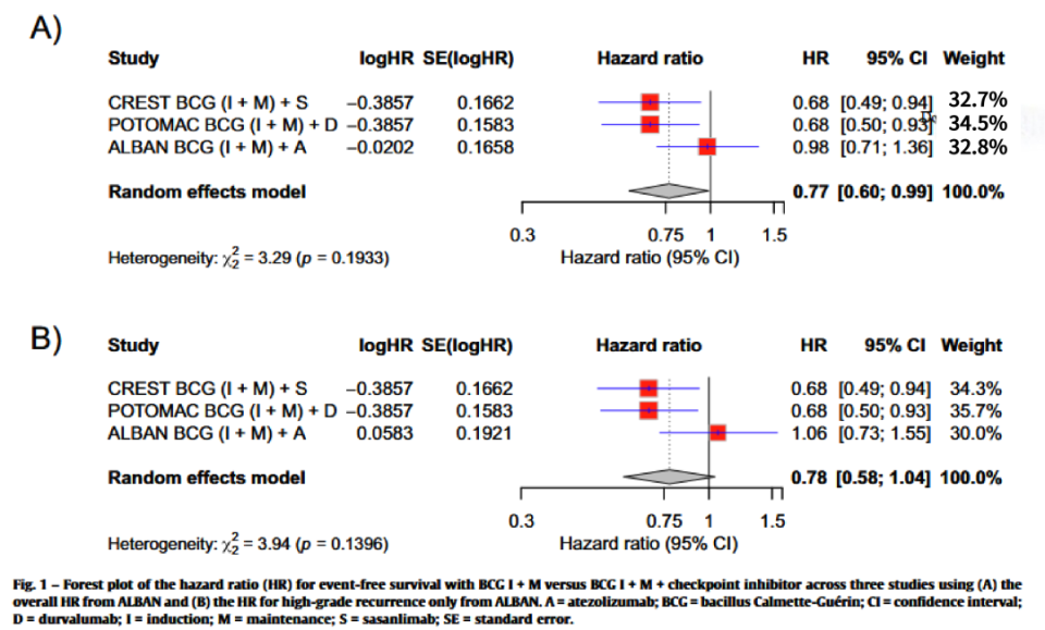 Scilipoti P, Zaurito P, Longoni M, Colecchia M, Montorsi F, Salonia A, Mercinelli C, Maiorano B, Necchi A, Briganti A, Moschini M. Efficacy and Safety of Checkpoint Inhibitors Combined with Bacillus Calmette-Guérin (BCG) in BCG-naïve High-risk Non-muscle-invasive Bladder Cancer: Synthesis of Evidence from the ALBAN, CREST, and POTOMAC Trials. Eur Urol. 2026 Mar;89(3):204-209. doi: 10.1016/j.eururo.2025.12.022. Epub 2025 Dec 31. Erratum in: Eur Urol. 2026 Feb 17:S0302-2838(26)00063-1. doi: 10.1016/j.eururo.2026.02.001. PMID: 41478774.