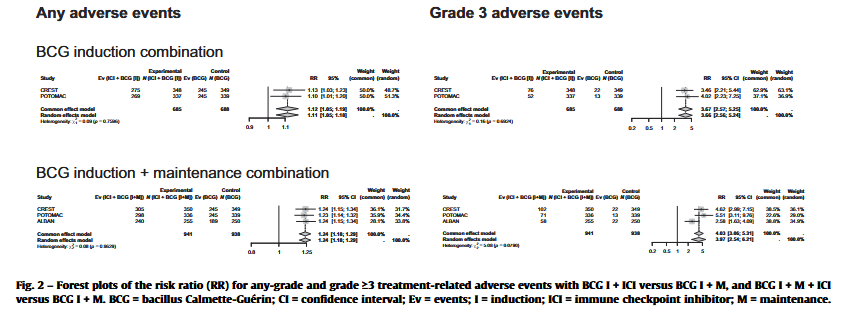 任何级别不良事件:联合治疗组任何级别AE亦显著增加。BCG诱导期联合治疗合并RR为1.12(95%CI 1.05-1.19),BCG诱导+维持联合治疗合并RR为1.24(95%CI 1.18-1.29)。