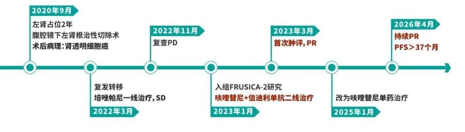晚期肾癌靶向治疗与免疫治疗的进展改善了晚期肾癌患者的生存预后,但对于一线酪氨酸激酶抑制剂(TKI)治疗失败的患者,二线采用靶向联合免疫治疗的方案既往缺乏高级别循证医学证据。2025年欧洲肿瘤内科学会(ESMO)年会报道的III期FRUSICA-2研究结果展现了呋喹替尼联合信迪利单抗在晚期肾癌二线治疗的疗效和安全性方面的潜力。本期将分享一例来自FRUSICA-2研究的晚期肾透明细胞癌病例,该患者一线TKI治疗后疾病进展,二线接受呋喹替尼联合信迪利单抗治疗,首次疗效评估即达到疾病缓解,截至报道前最近一次(2026年4月)随访,部分缓解(PR)已持续超过37个月,且治疗期间患者耐受性良好,未见严重不良事件以及免疫相关不良事件,为该治疗策略的临床应用提供了有价值的实践参考。