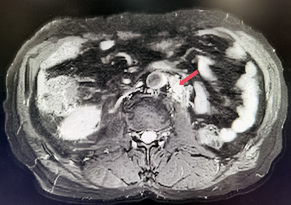 2022年3月:患者因“左腰痛”复查。胸部CT提示双肺微小结节,较前未见明显变化;腹盆MR示:左侧腹膜后多发结节及肿块影,较大者约5.7cm*5.1cm;考虑患者诊断为转移性肾透明细胞癌,IV期,IMDC评分0分,低危组。予培唑帕尼一线治疗8个月,最佳疗效SD。