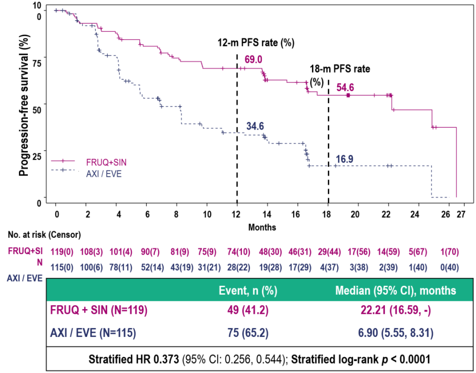 [5] Dingwei Ye, et al. Fruquintinib (FRUQ) plus sintilimab (SIN) versus axitinib (AXI) or everolimus (EVE) monotherapy as 2L treatment in pts with locally advanced or metastatic renal cell carcinoma (RCC): Results from phase III part of a randomized, open-label, active-controlled phase II/III study (FRUSICA-2). ESMO 2025,2592MO