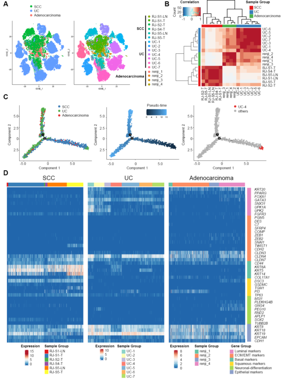 图2. 膀胱鳞癌及其他相关类型的单细胞表达谱特征。(A)tSNE图显示膀胱鳞癌、膀胱腺癌、尿路上皮癌的肿瘤单细胞分布情况。(B)几类膀胱癌的单细胞表达谱相似性分析。(C)几类膀胱癌单细胞的拟时序轨迹变化分析,其中UC-4样本的病理诊断为尿路上皮癌伴鳞样分化。(D)几类膀胱癌的肿瘤单细胞中代表性标志物的表达情况。
