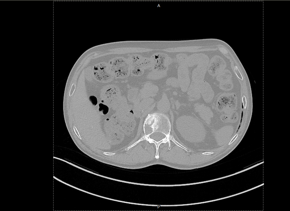 △2025年8月疗效评估时患者CT检查(上)及SPECT骨扫描(下)提示新发胸椎转移