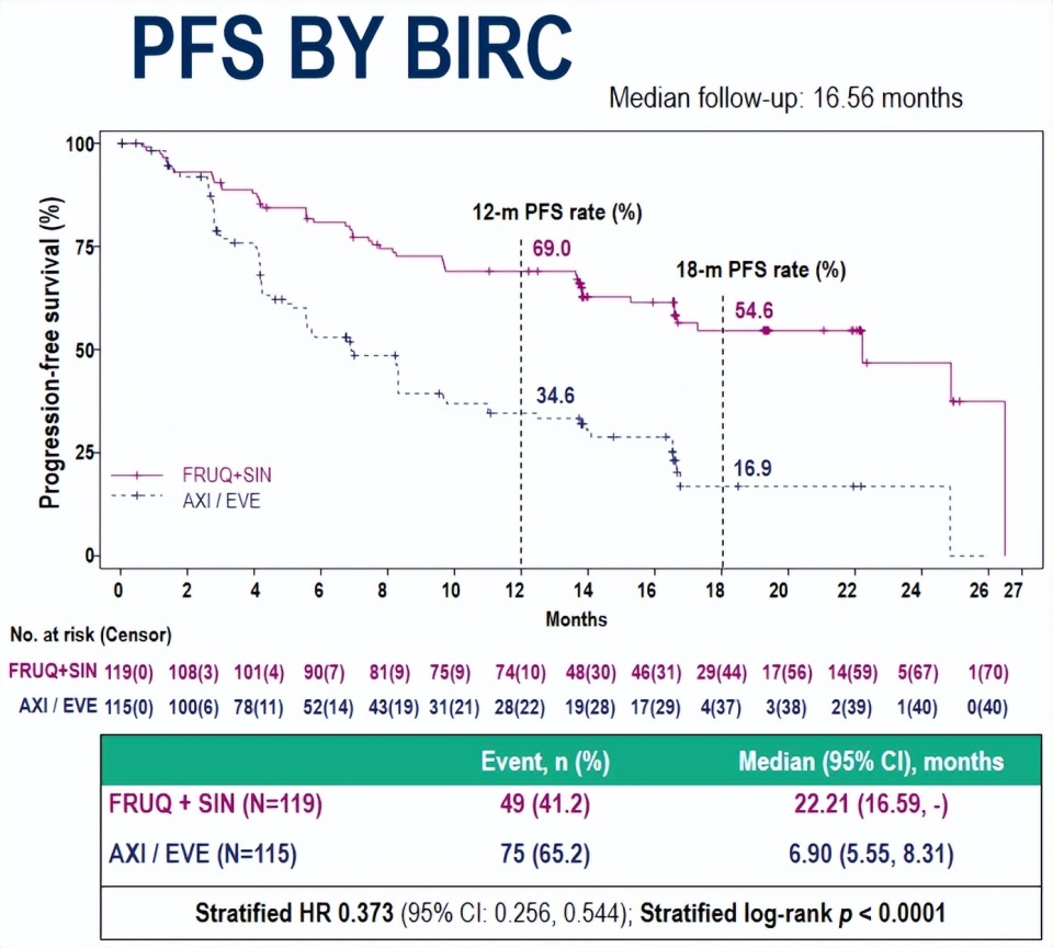 随着晚期肾癌治疗方式的持续发展,其二线治疗领域仍存在诸多未被满足的临床需求。既往一线单纯TKI治疗失败的患者,二线可选择的靶靶联合方案虽较单药靶向治疗疗效有所提升,如依维莫司联合伏罗尼布中位mPFS为10.0 个月、仑伐替尼联合依维莫司中位PFS为14.6个月;但临床仍有进一步优化的空间[2-3]。当前FRUSICA-2 III期研究结果证实,呋喹替尼联合信迪利单抗在晚期肾癌二线治疗中展现出显著的临床获益:BIRC评估的呋喹替尼联合信迪利单抗组中位PFS达到了22.21个月,显著优于对照组(阿昔替尼或依维莫司单药治疗)的6.90个月(HR 0.373,P<0.0001,下图)[4]。作为晚期肾癌二线治疗领域首个全国产靶免联合治疗方案,该研究结果已于2025年ESMO大会上进行口头报告,有望成为晚期肾癌患者二线治疗的一项新选择。