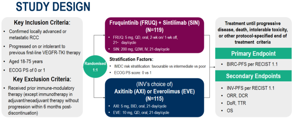 [4] Ye D, et al. 2592MO Fruquintinib (FRUQ) plus sintilimab (SIN) versus axitinib (AXI) or everolimus (EVE) monotherapy as 2L treatment in pts with locally advanced or metastatic renal cell carcinoma (RCC): Results from phase III part of a randomized, open-label, active-controlled phase II/III study (FRUSICA-2). Ann Oncol. 2025;36(supplement 2):S1298-1299. doi:10.1016/j.annonc.2025.08.3208
