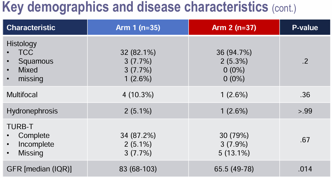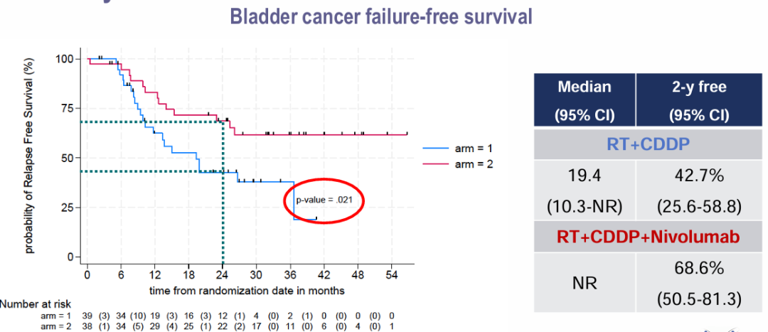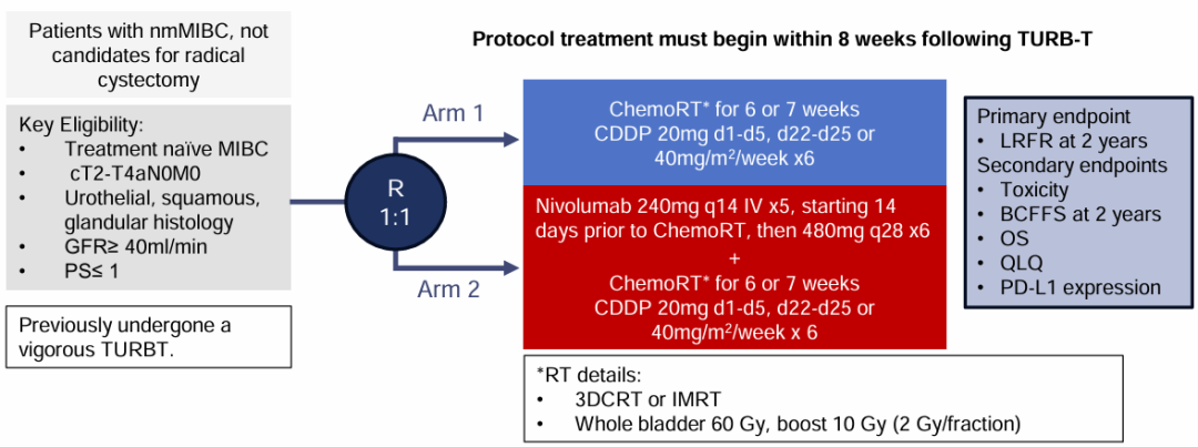入组nmMIBC患者的分期为cT2~T4a N0 M0,既往接受过最大限度TURB-T,随机分组接受每2周的240 mg纳武利尤单抗治疗,联合放化疗(第一次剂量在放疗开始前14天),然后接受每4周的480 mg纳武利尤单抗治疗6个周期,或仅接受放化疗方案(顺铂与根治性放疗同时进行)。两组均将放射治疗剂量增加至66~70 Gy(每次2 Gy)。主要终点是2年局部无复发生存率(LRFR)。本研究主要进行了疗效和毒性分析。