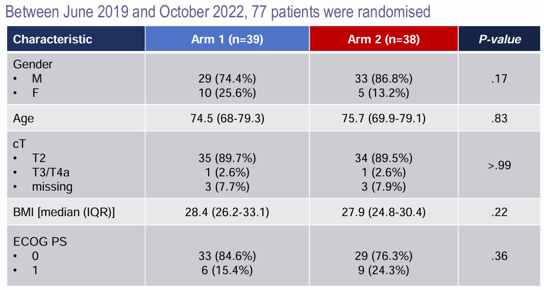 2019年6月至2022年10月期间,纳入77名患者并随机分组:39名患者接受放化疗(第1组),38名患者接受纳武利尤单抗联合放化疗(第2组)。患者基线特征及组间差异如下。