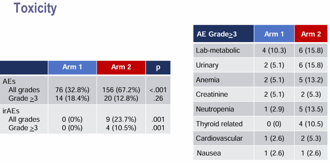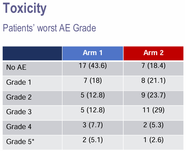 相对而言,第1组的无AE患者比例较第2组更多:17人(43.6%)vs 7人(18.4%),P=0.017。组间3级以上不良事件发生率无明显差异:10人(25.6%)vs. 14人(36.8%),P=0.29。研究治疗期间虽然发生3名患者死亡,但无一例死亡与治疗相关:1人死于covid感染,2人死于疾病进展。
