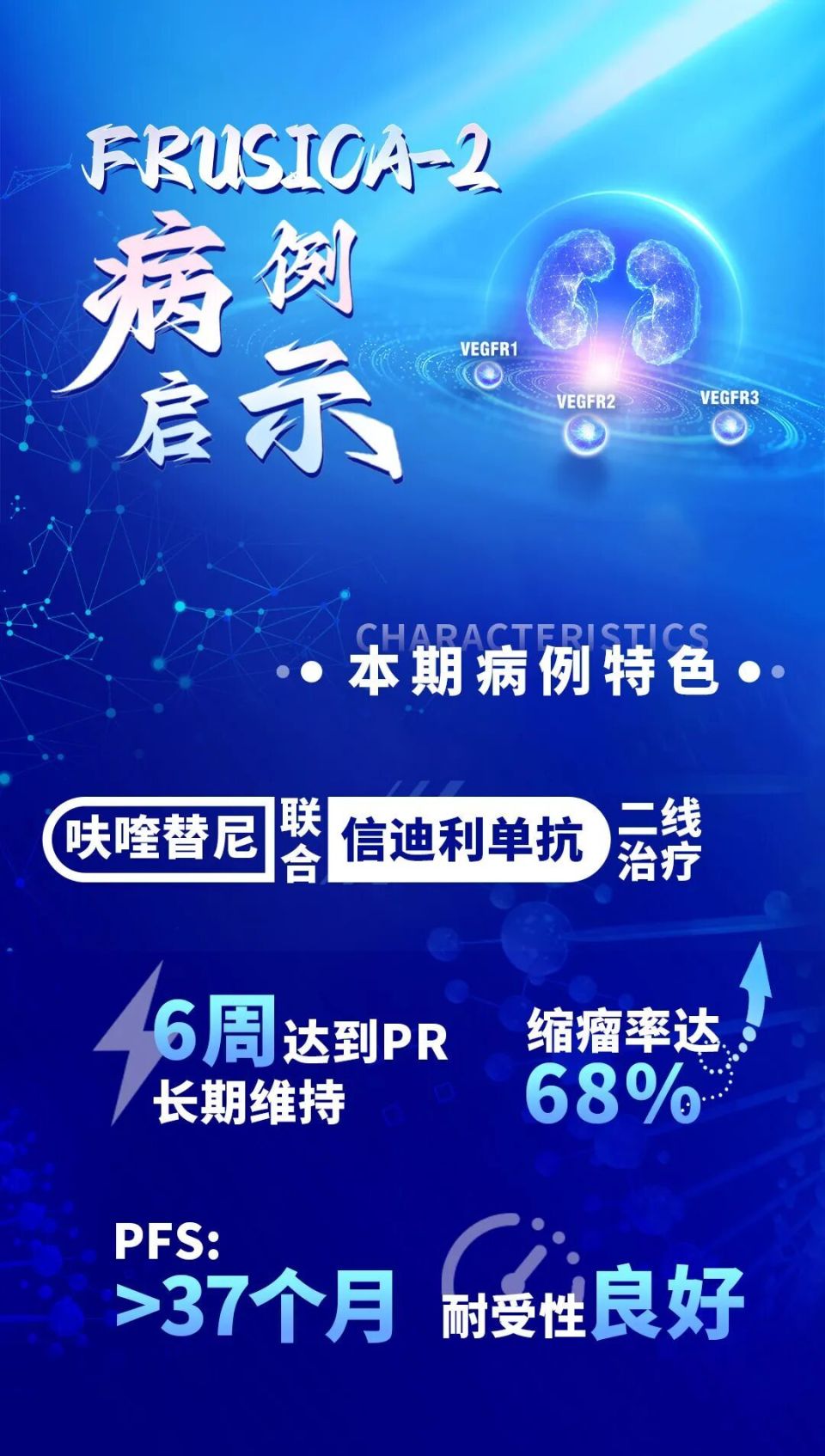 晚期肾癌靶向治疗与免疫治疗的进展改善了晚期肾癌患者的生存预后,但对于一线酪氨酸激酶抑制剂(TKI)治疗失败的患者,二线采用靶向联合免疫治疗的方案既往缺乏高级别循证医学证据。2025年欧洲肿瘤内科学会(ESMO)年会报道的III期FRUSICA-2研究结果展现了呋喹替尼联合信迪利单抗在晚期肾癌二线治疗的疗效和安全性方面的潜力。本期将分享一例来自FRUSICA-2研究的晚期肾透明细胞癌病例,该患者一线TKI治疗后疾病进展,二线接受呋喹替尼联合信迪利单抗治疗,首次疗效评估即达到疾病缓解,截至报道前最近一次(2026年4月)随访,部分缓解(PR)已持续超过37个月,且治疗期间患者耐受性良好,未见严重不良事件以及免疫相关不良事件,为该治疗策略的临床应用提供了有价值的实践参考。
