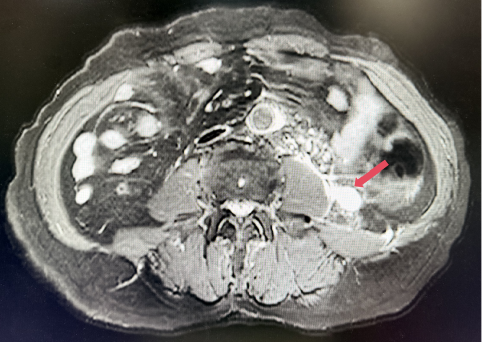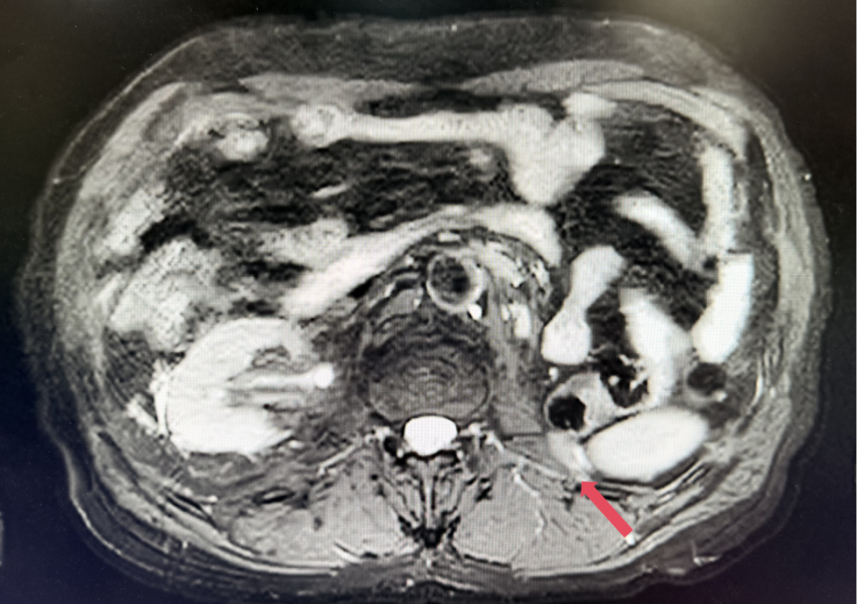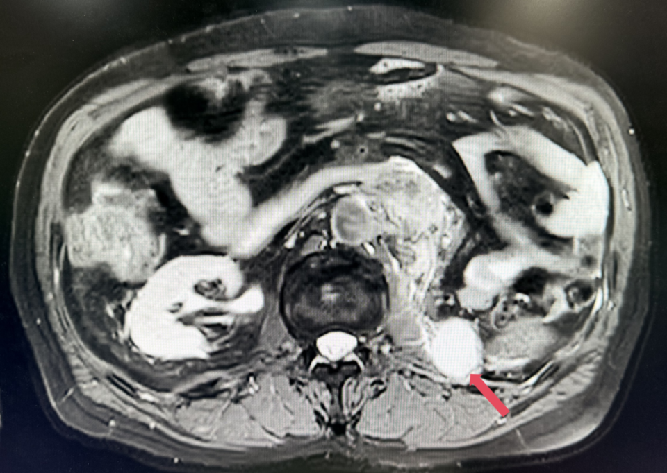 2022年11月:MR示左侧腹膜后多发结节及肿块影,较前略增大,6.1*5.5cm,另可见邻近左侧后腹膜多发DWI异常信号结节,较前新发,较大者2.4*2.1cm,考虑疾病进展(PD)。
