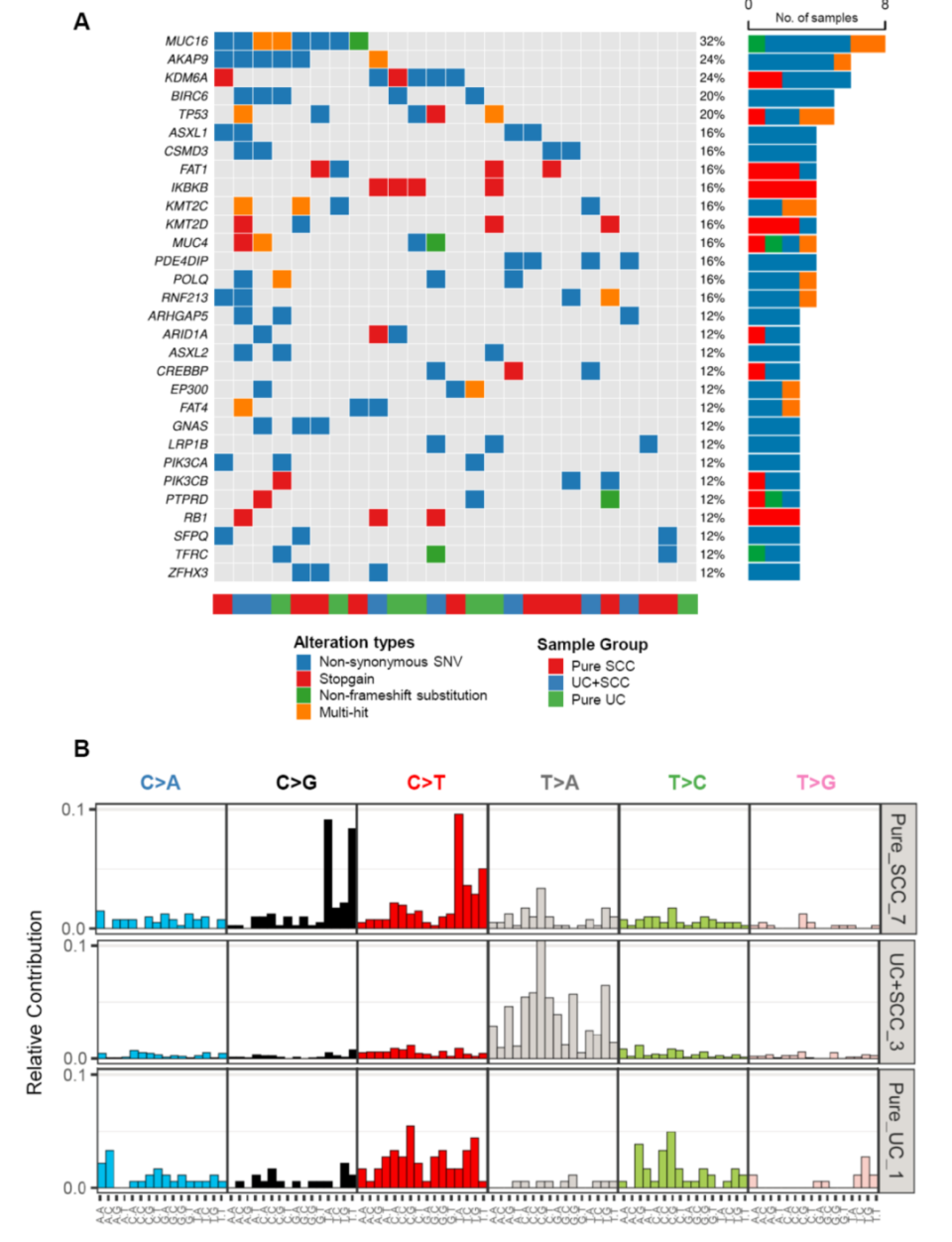 图1. 膀胱鳞癌及其他相关类型的突变特征。(A)几类膀胱癌中的高频突变基因。(B)膀胱癌中的几种代表性突变指纹。