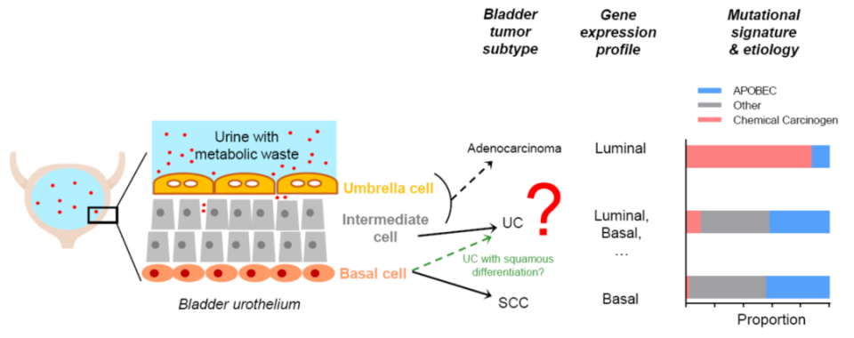 图3. 主要研究发现。综合分析基因表达谱和突变特征可探索几类膀胱癌的细胞起源和潜在病因。