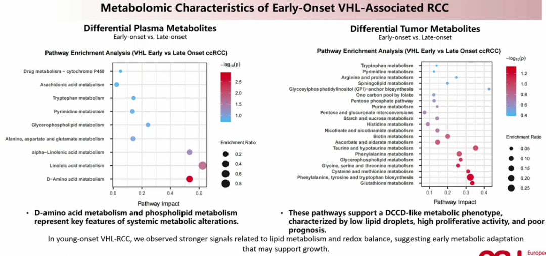 传统的VHL综合征管理模式,主要依赖影像学定期随访,但VHL相关肾癌具有多灶性、双侧性、高复发率、个体进展差异大的特点,单纯依靠影像学随访,很难实现真正的疾病管理前移。我们通过对患者血浆、肿瘤组织及家系配对样本的多组学分析发现,早发患者与家系子代人群的代谢谱,存在高度一致且可重复的异常改变,这提示这些关键的代谢异常,可能早于影像学可见的肿瘤病灶出现。