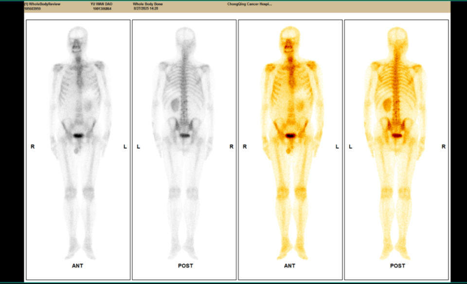患者2025-02-13起转为呋喹替尼单药治疗,剂量及用法同前,共治疗9个周期,后患者于2025-08-21复查CT及SPECT骨扫描,靶病灶疗效评价仍维持PR,但检查同时示胸12椎体存在转移可能,综合考虑疗效为疾病进展(PD),遂终止呋喹替尼治疗。
